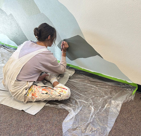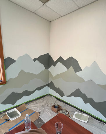 This layered mountain mural at the Lincolnc courthouse was created to transform a space that had been in a state of disrepair and felt deeply unwelcoming for foster children visiting while their guardians were in court. The design wraps around half the room, featuring a whimsical, calming mountain scape that brings a sense of peace and connection to Oregon’s natural beauty.